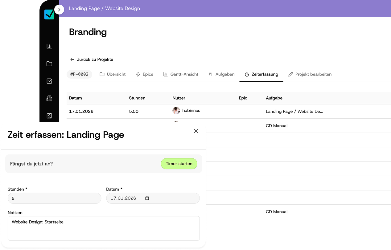 Buche die Zeit direkt auf die Aufgabe oder einfach auf das Projekt. Keine Zettelwirtschaft am Freitagabend mehr.