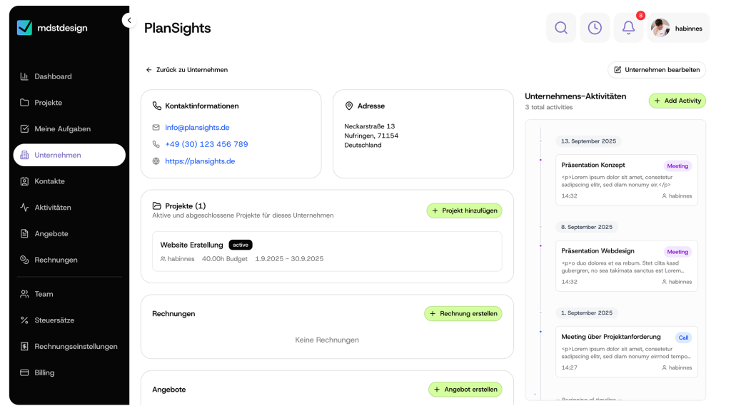 Mit PlanSights hast du ein mächtiges All-In-One Tool: vom CRM über ausführliches Projektmanagement bis zur Abrechnung.